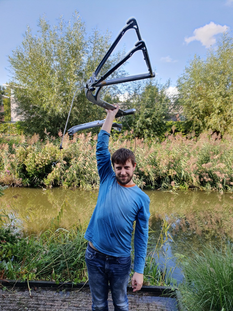 At the end of the day, the bike was fully taken apart and B stood victorious, holding aloft the frame!