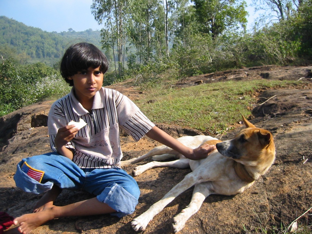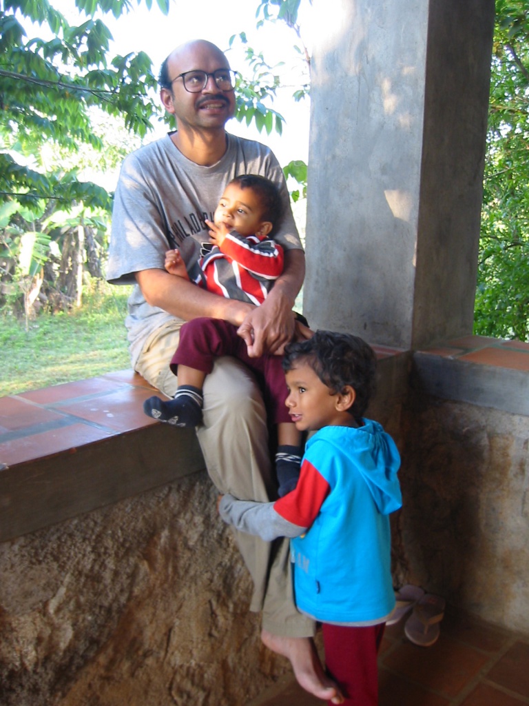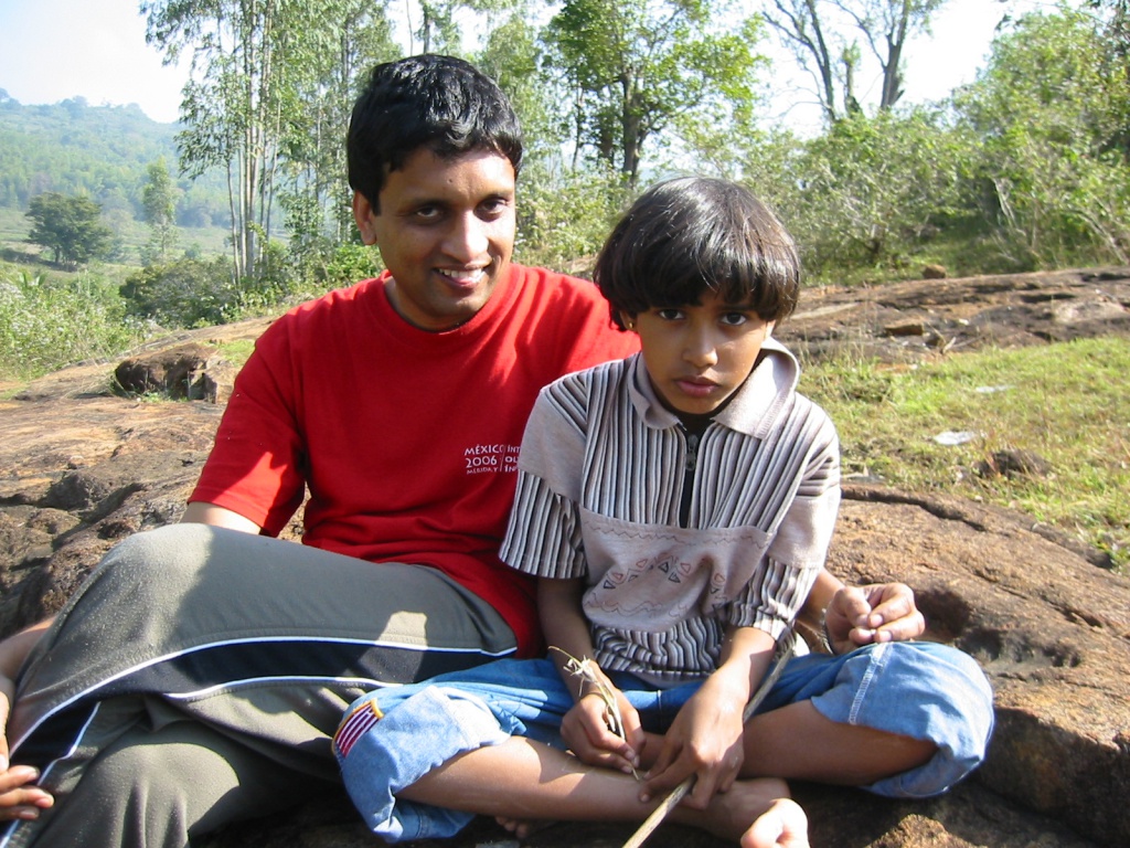 We come to an opening and see a stream – an unexpected treat for the kids. The water is about 50 feet down from the path. I settle down on some rocks and watch the kids play in the stream. I request Dino and Nikhil to watch Akash in the stream. He is fairly sure footed and careful so I don’t worry much. He’s completely in the buff, totally enjoying his time in the water. Madhavan takes some close-up pictures of him. Mostly he plays by himself, as the older kids cross and re-cross the stream, go up the opposite hill for a bit, and fool around in their own way. Frisky the dog has accompanied us and is also content lying in the sun on the rocks. Today’s picnic is murukku and apples. I am surprised that the kids ask for the apple slices as much as the murukku. Finally time is called, and we march back home. The rest are just uneventful details of last minute packing, goodbyes and a 3 hour car ride to Salem, quick stop at Sunder’s parents’ place, and a 5 hour train ride to B’lore.