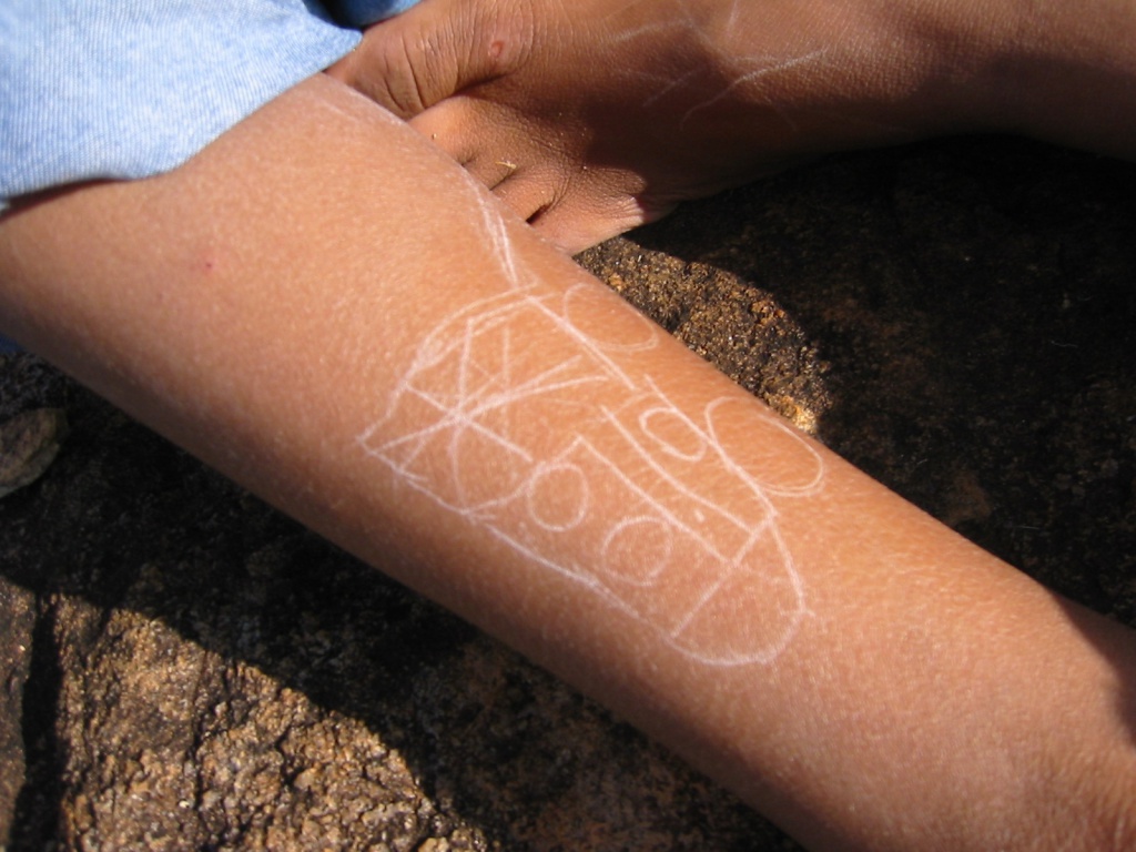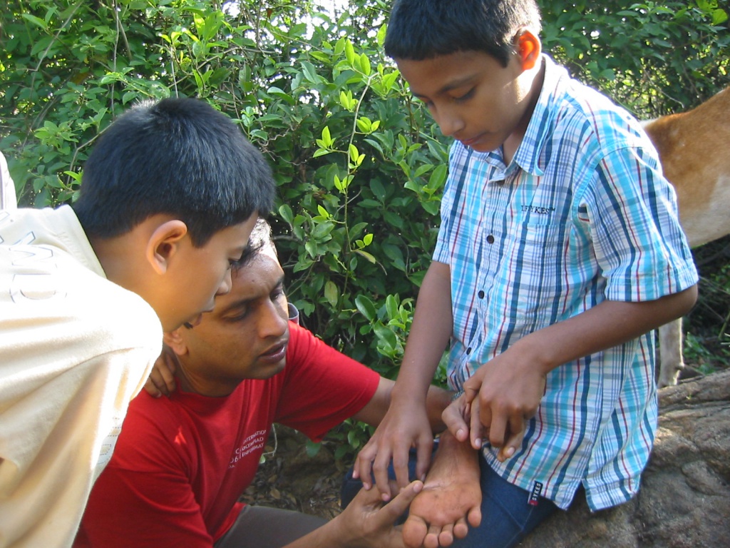 We walk along a path which is lined by tall bushes on either side. Lavanya has named this section the tunnel. Lavanya and I walk together for a while. We go past the first evening’s boulders, and I see the kids ahead of me have stopped – Badri has a thorn in his foot. I try removing it, then Madhavan tries, then I try and we somehow remove it. A small sense of achievement!