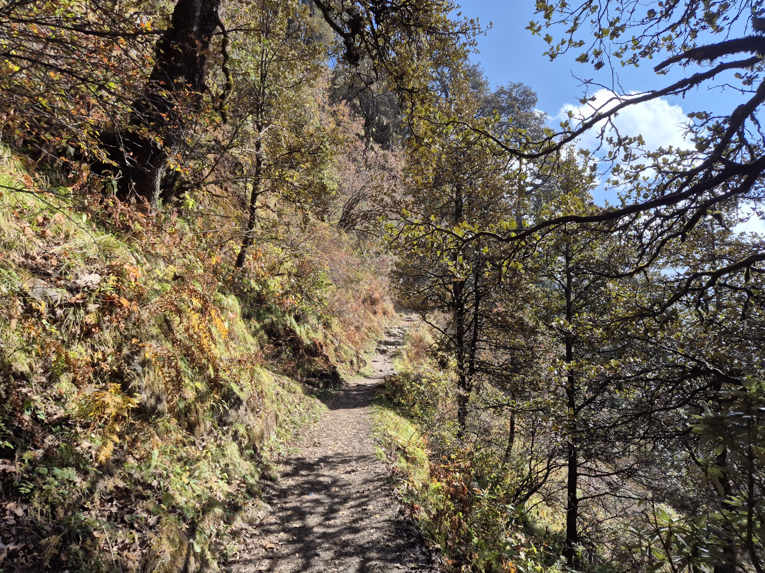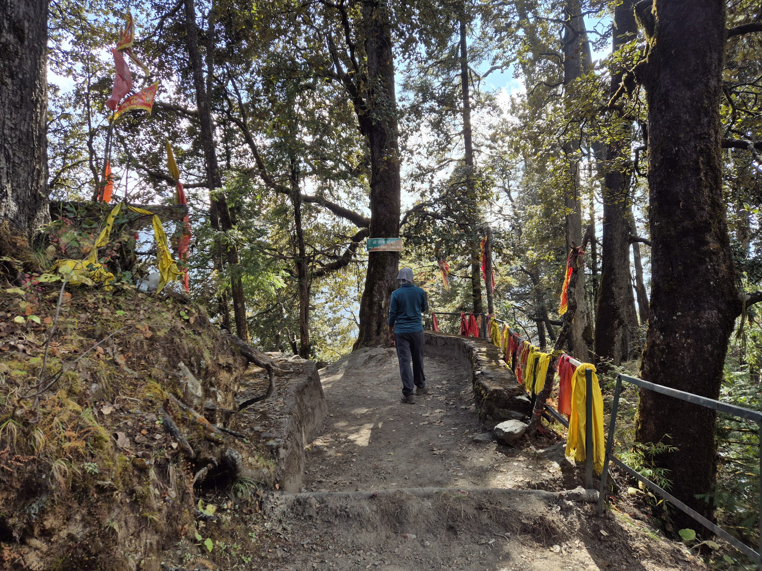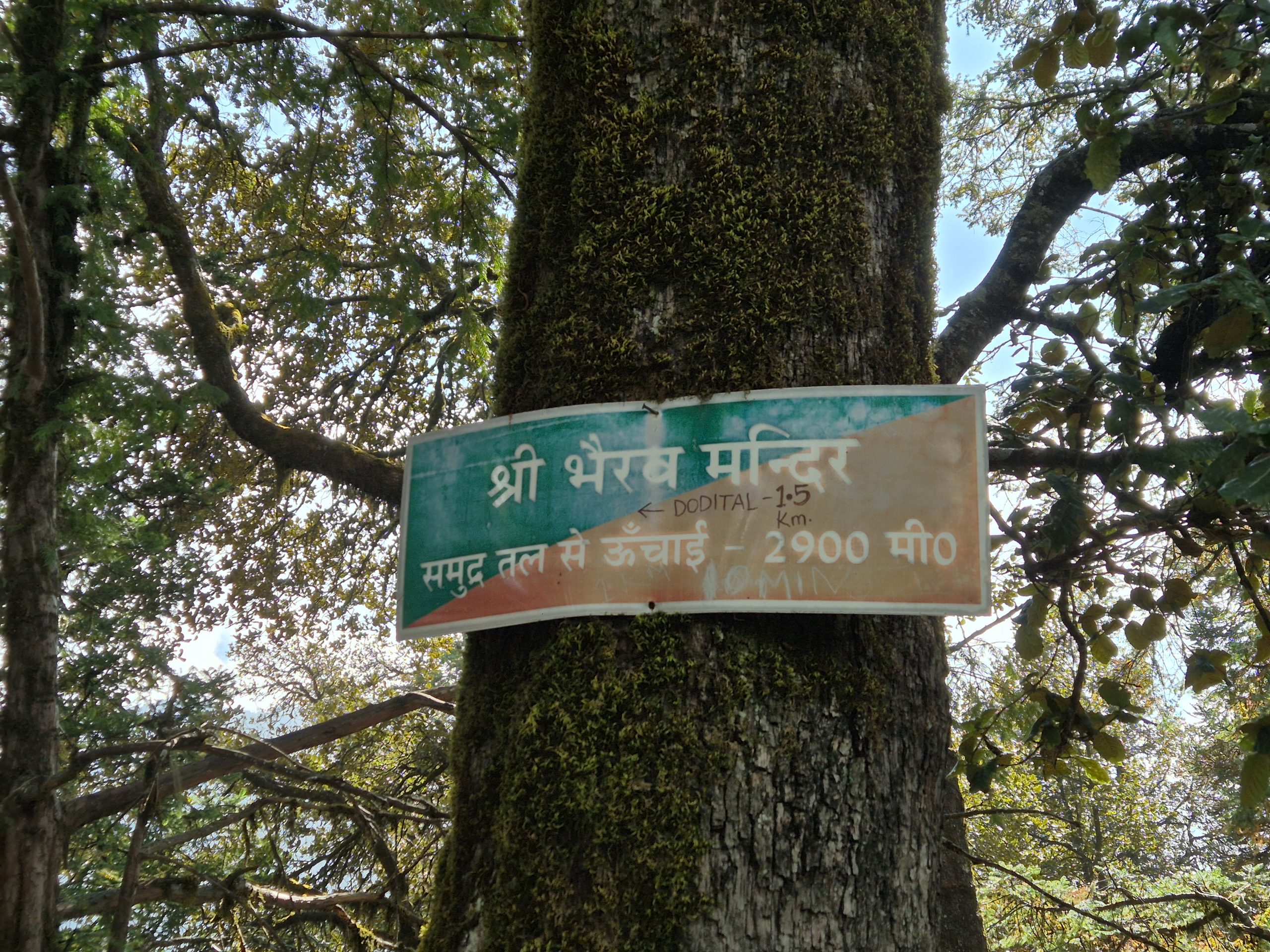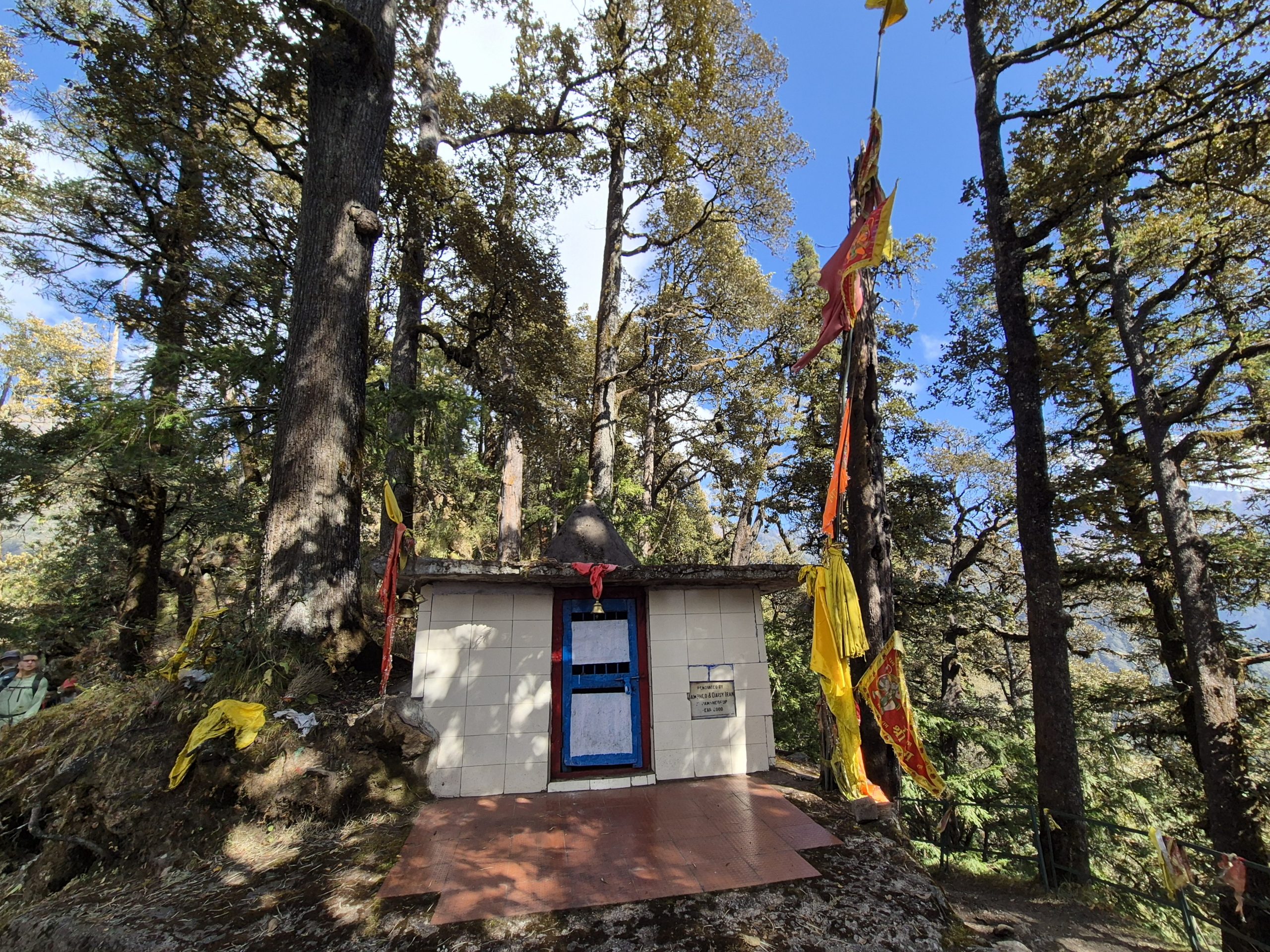 Reached a Bhairav temple near the end of the day’s walk, and after that the trail went alarmingly downhill. I came to Vinay and Ak, who were ahead of our guide and had stopped, wondering if we’d lost the path. Just then, a guide from another group walked past and assured us we were fine – as indeed we were, for we reached Dodital camp shortly after.