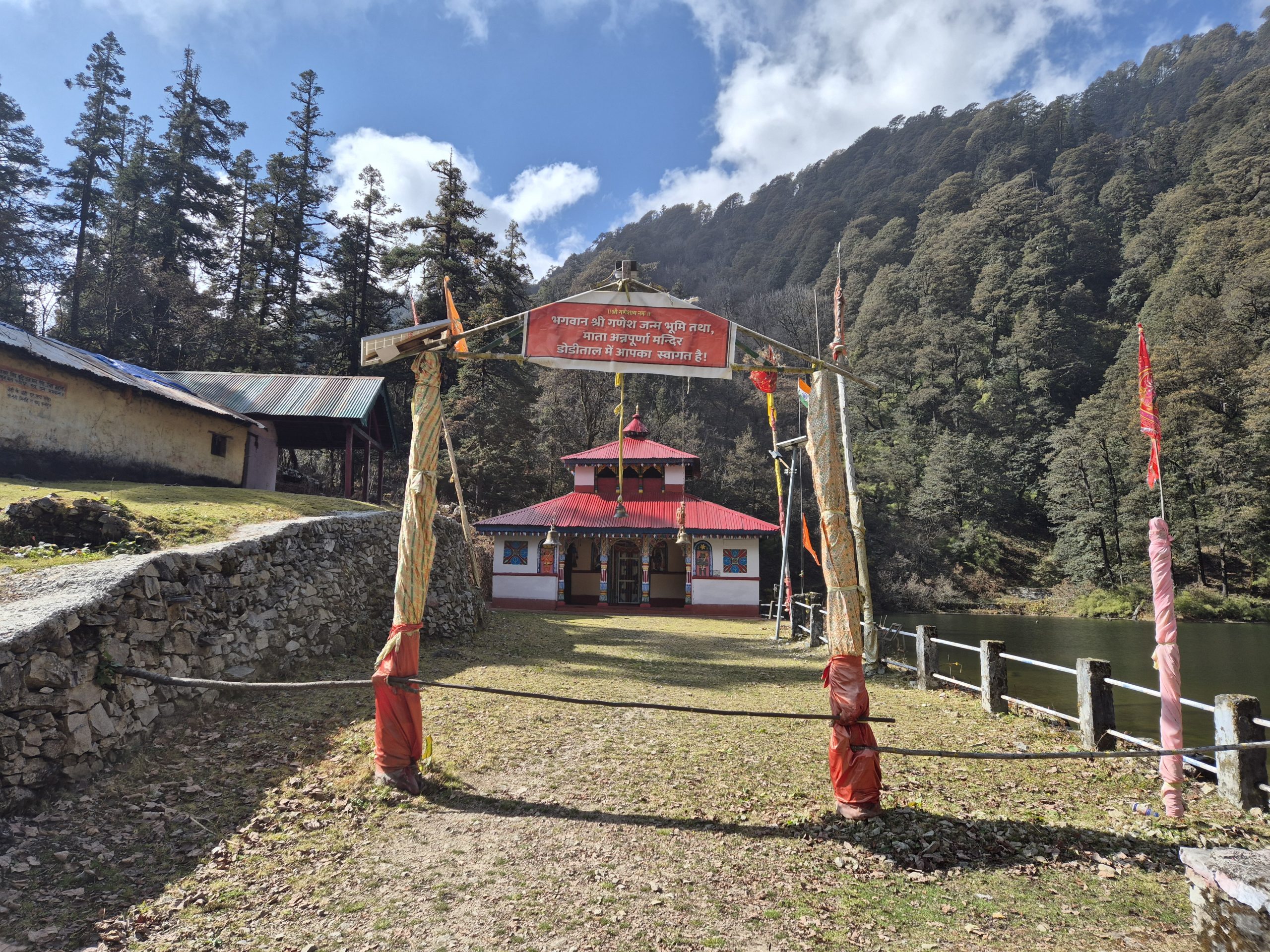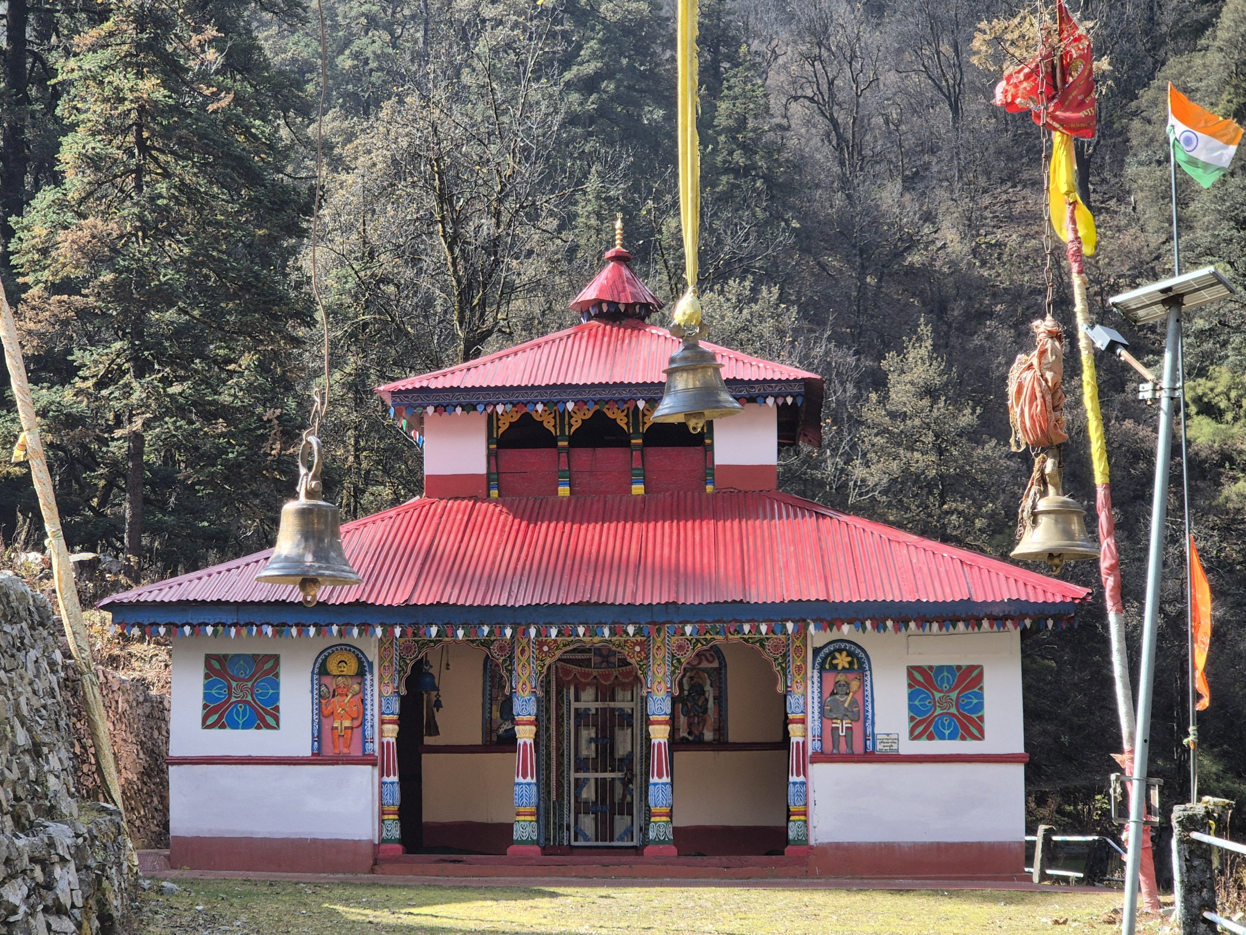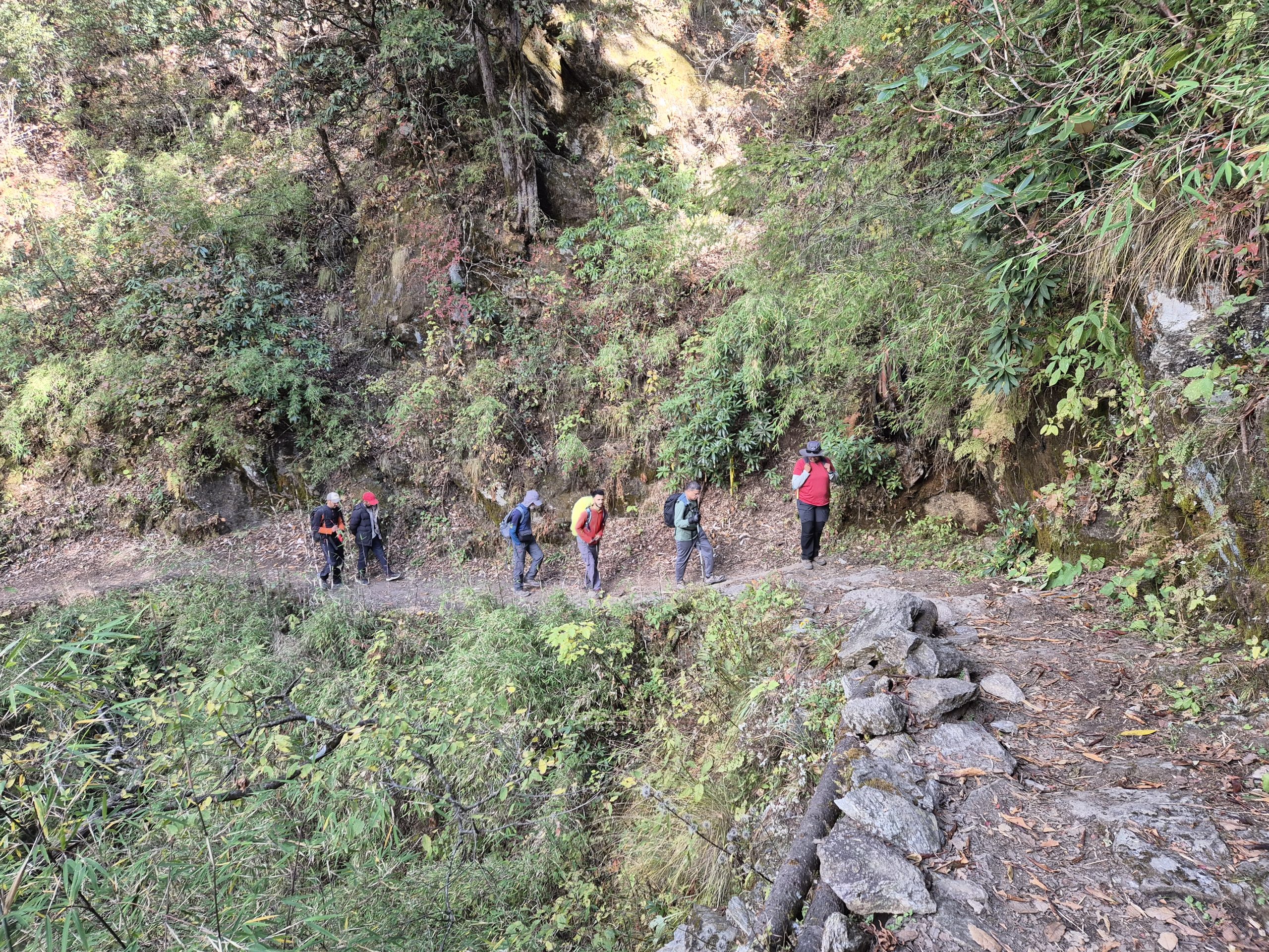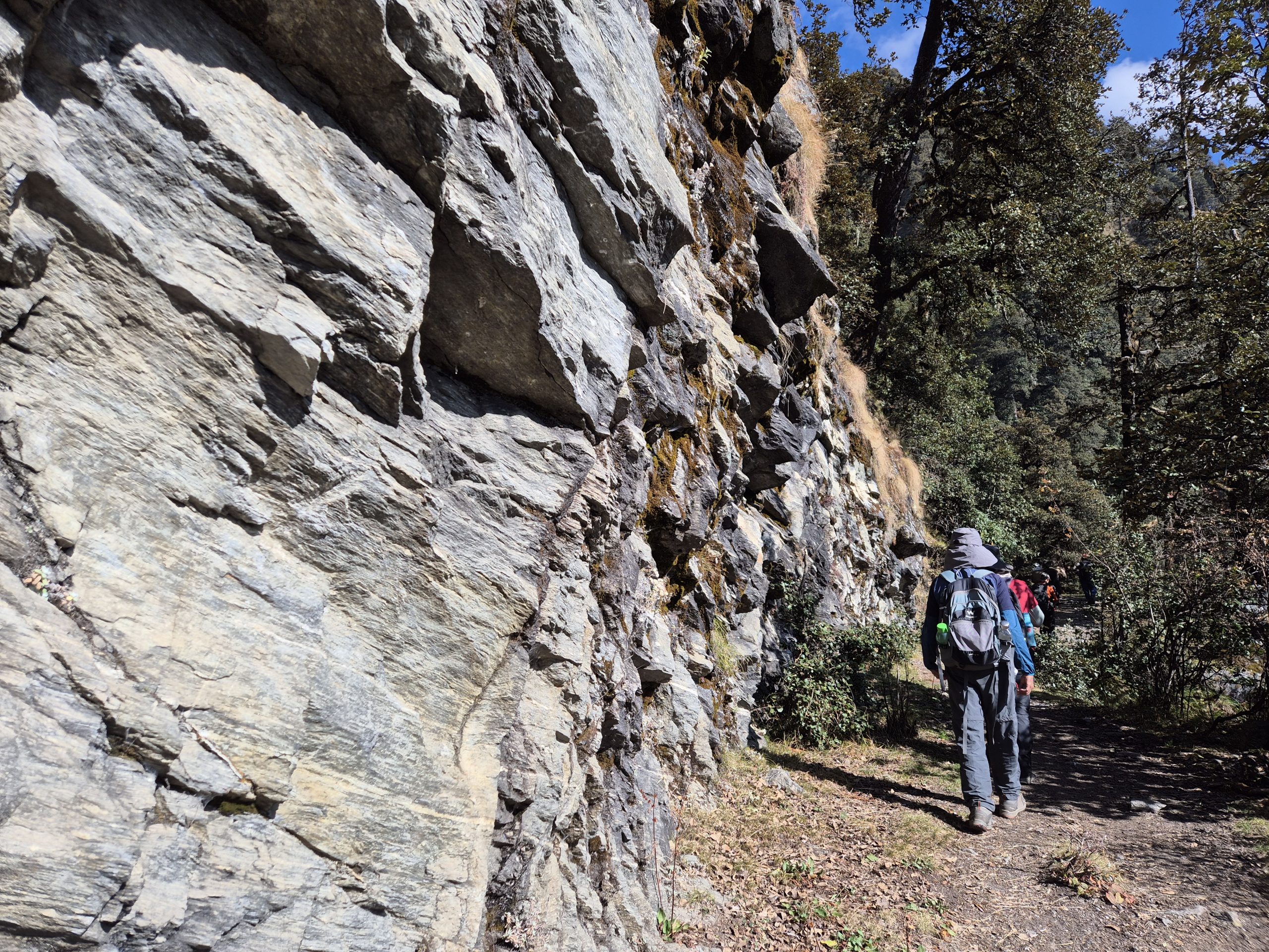 Reached a Bhairav temple near the end of the day’s walk, and after that the trail went alarmingly downhill. I came to Vinay and Ak, who were ahead of our guide and had stopped, wondering if we’d lost the path. Just then, a guide from another group walked past and assured us we were fine – as indeed we were, for we reached Dodital camp shortly after.