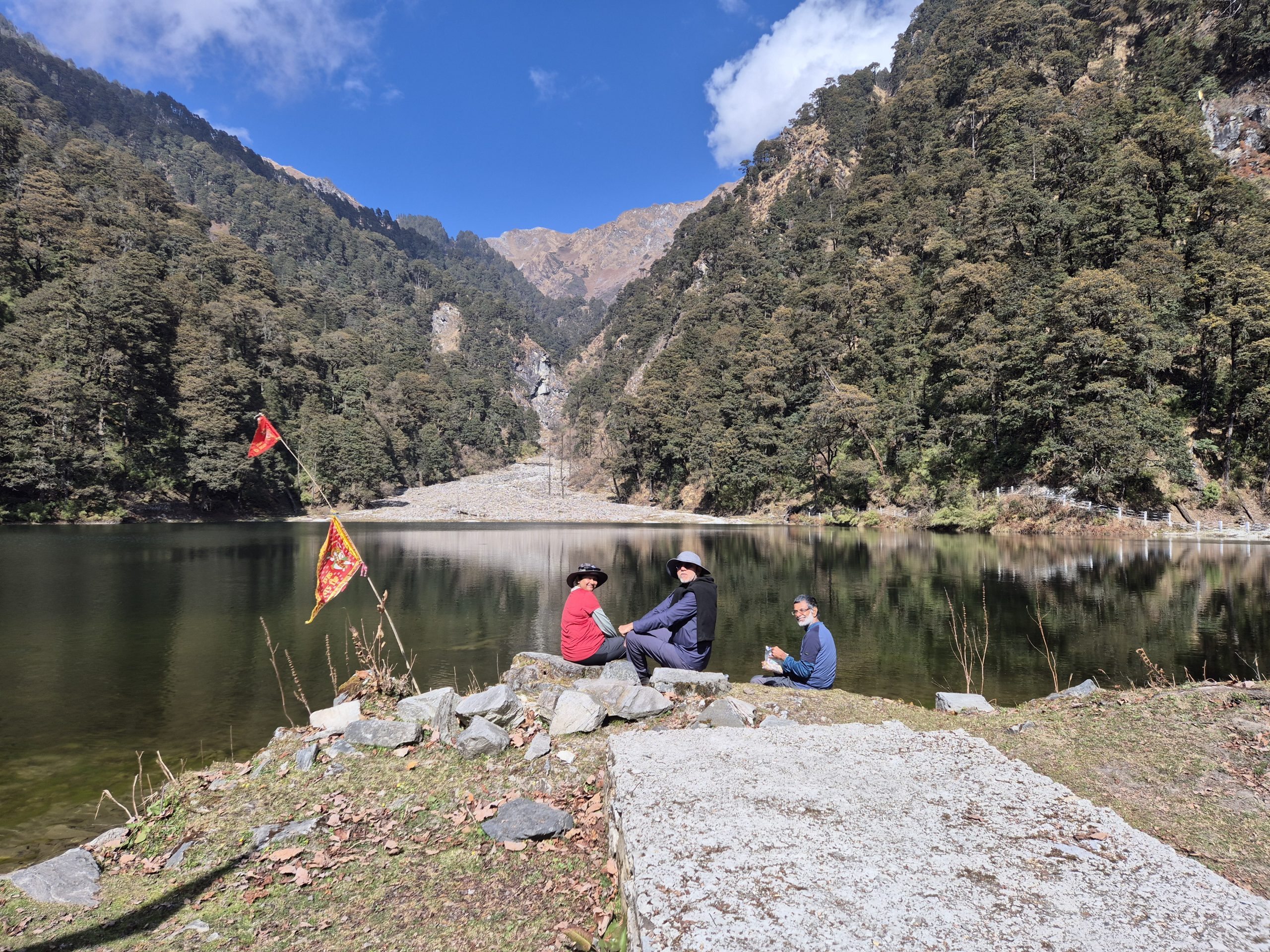 A brilliant sunny afternoon. The camp site was lovely: A deep green circular lake ringed by tall brown and green mountains. Fish frequently broke surface – Himalayan trout, we were told. Some of us sat at the edge, taking it all in.