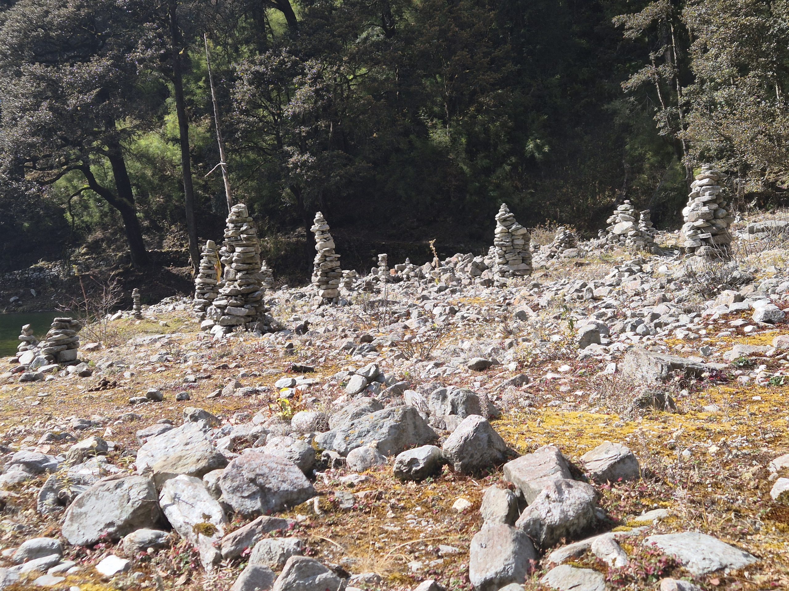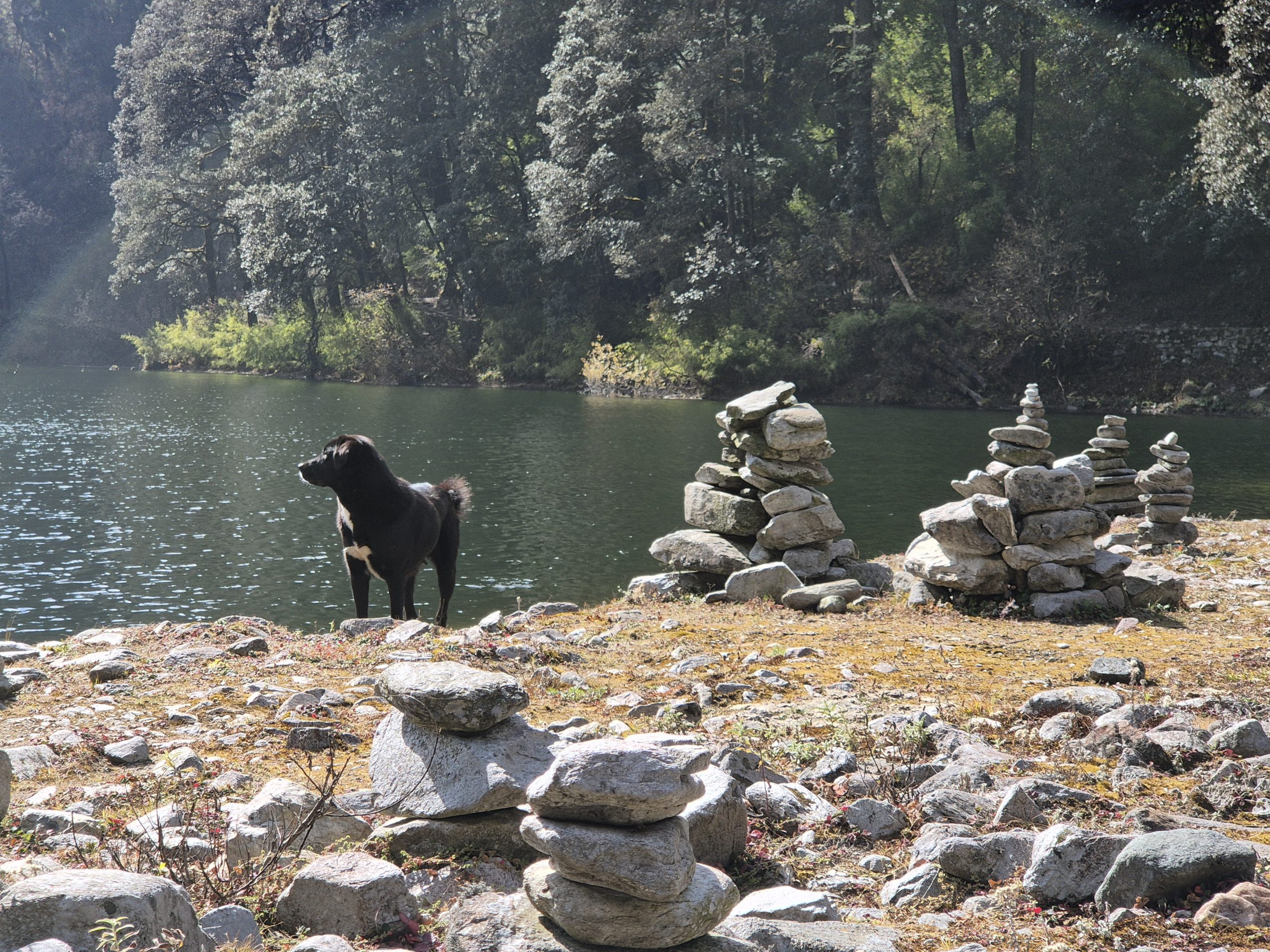 Later we walked around the lake’s perimeter. On the far side lay a stony valley filled with man-made cairns – piles of rock built with hope and prayer. After lazing on comfortable stone perches, we each made our way back. Ak gave me a photography assignment: capture him from the opposite edge – the result was not as dramatic as we imagined. He is a tiny black speck among the white rocks and mountains.