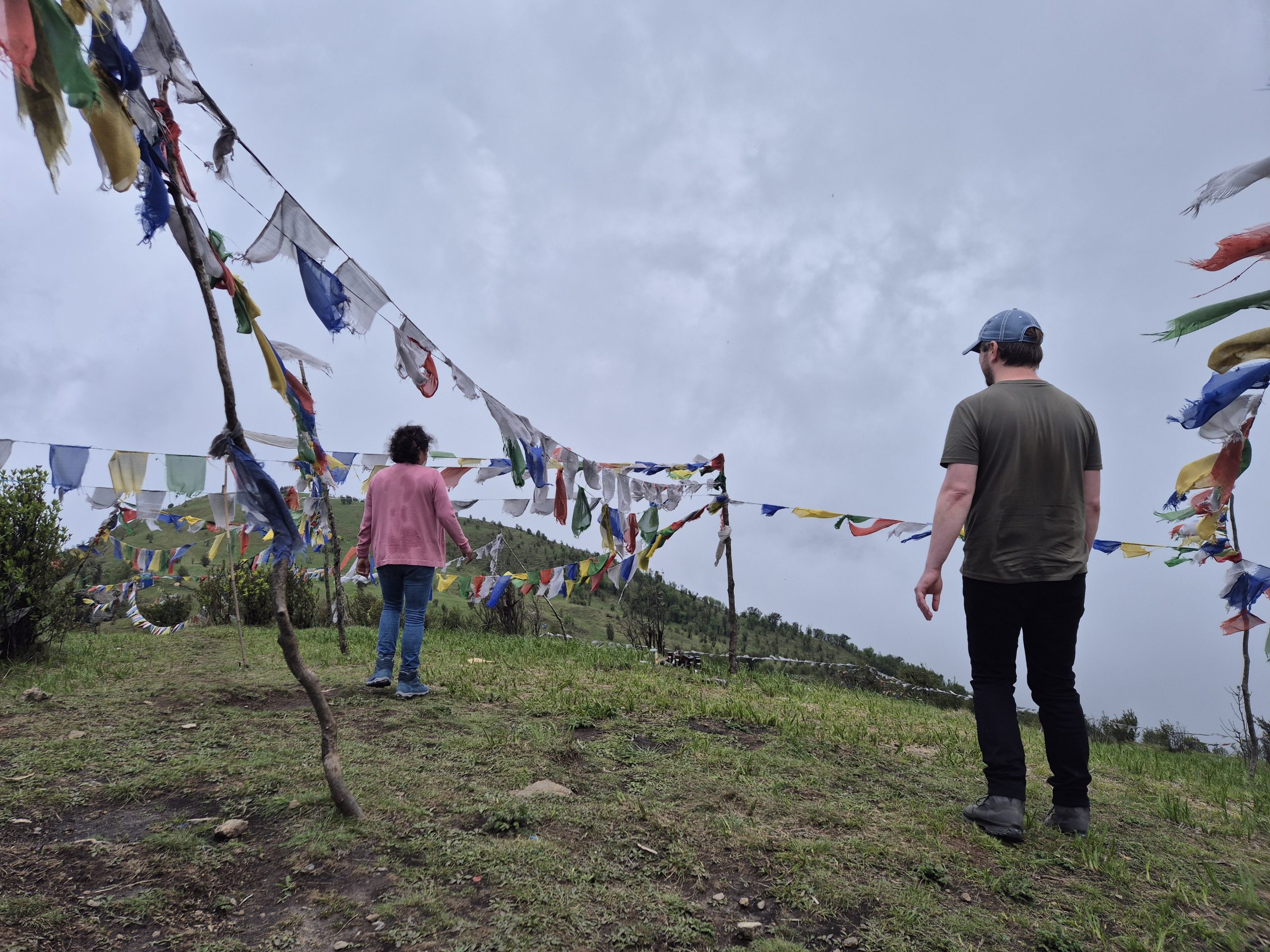After meeting our lunch hosts briefly, we went to see the actual top of Tonglu complete with a million colorful prayer flags. The views were alternately cloud-covered and clear, both beautiful in their own ways. When the clouds cleared, we could see the hamlet of Tumling just across the border in Nepal.